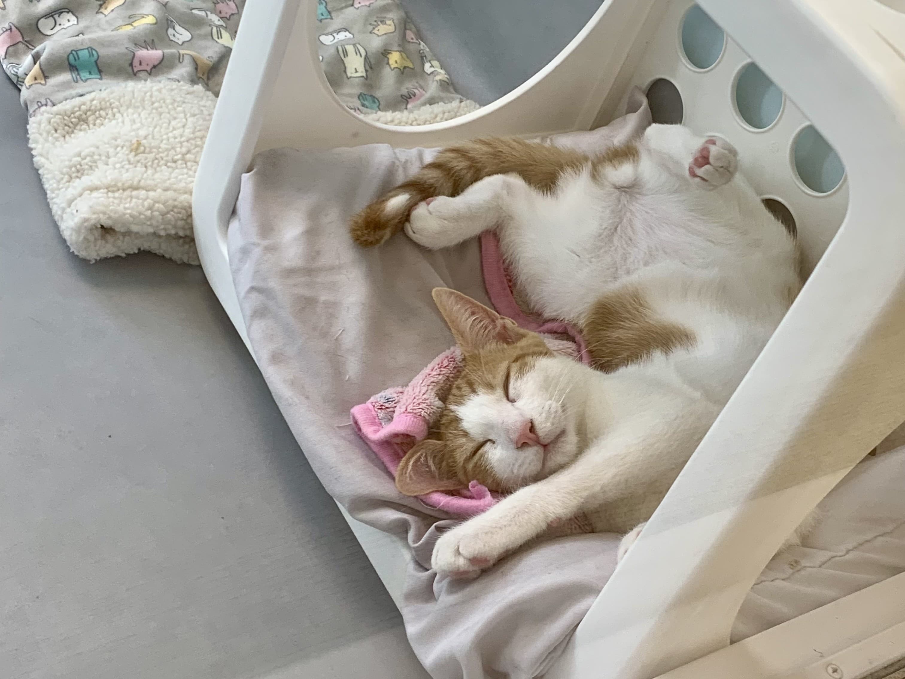 Known only as Mama, a skinny, terrified white cat was brought to Gifford in June with her four 3-week-old kittens — Parsnip, Rufio, Sam, and Nog — after being trapped on a local street. Mama was FIV+ and all four kittens were as well.